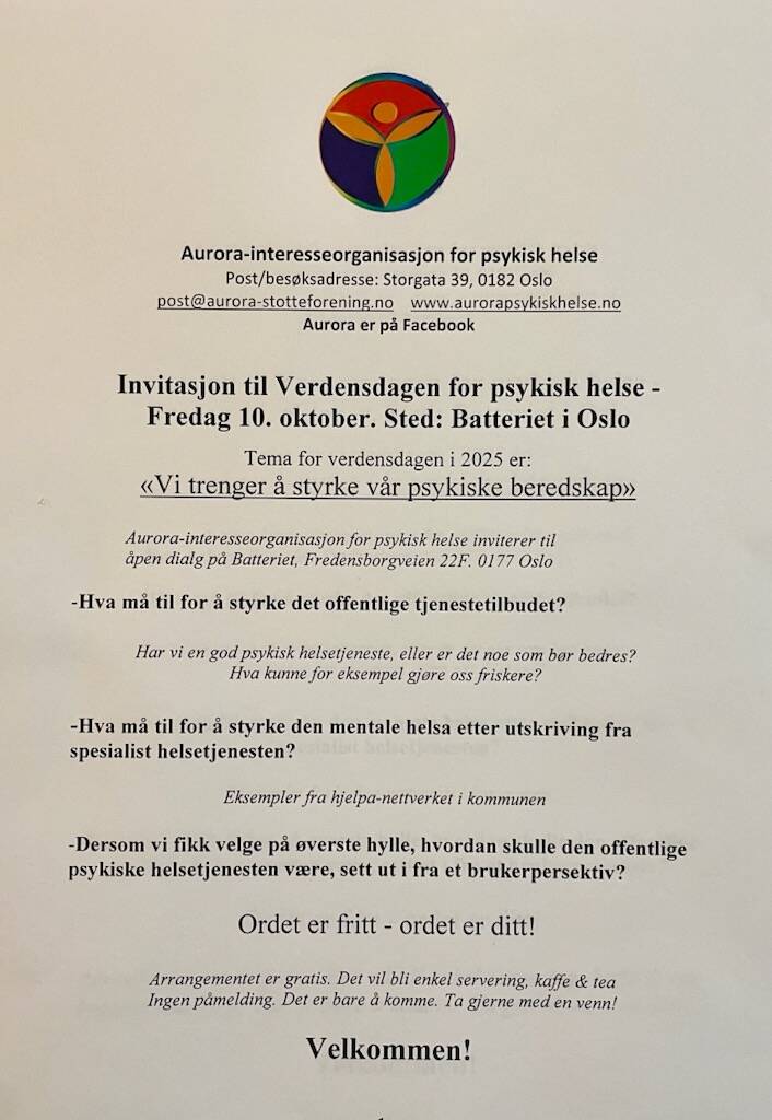Det ble til slutt 20 deltakere som kom innom Batteriet på verdensdagen fredag den 10/10. Aurorafolket fylte lokalet med kommenterer til advokat Kjetil Lund sitt foredrag på YouTube, WSO. Hans konklusjon er at norske helsemyndigheter finner det ikke mulig å endre praksisen rundt tvangsmedisinering, selv om den ikke er hensiktsmessig for pasientene.