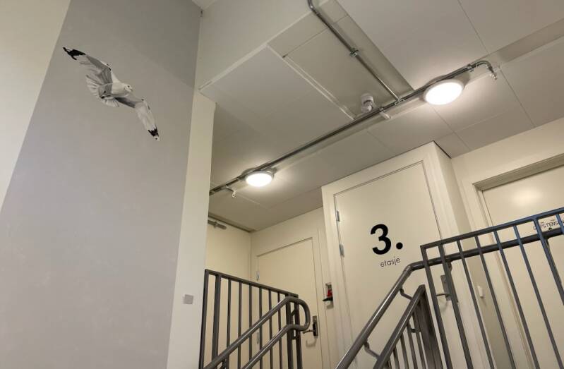 Fra parkeringsanlegget under bakken er det adgang til 6 trappeløp i fem etasjer, der hver oppgang har fått sin egen farge.